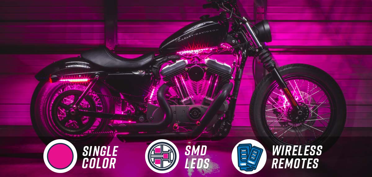 LEDGlow motorcycle underglow light kits are much brighter by featuring more LEDs, and the light strips are much thinner than the standard motorcycle LED strip kit. These pink motorcycle LED lights feature an expanded LED count with SMD chips, resulting in more LEDs working together to create a vibrant glow surrounding your bike. A single SMD chip contains 3 concentrated LEDs which produce wide angle illumination with less spotting than standard 5mm LEDs.